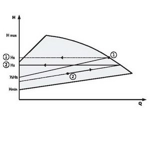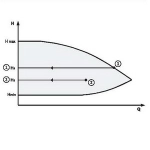 Насос имеет два режима регулирования (переменный (dp-v) и постоянный (dp-c) перепад давления). При выборе режима (dp-c), электроника поддерживает создаваемый насосом перепад давления HS постоянным в допустимом диапазоне значений расхода. При выборе режима (dp-v) электроника изменяет заданное значение перепада давления насоса линейно от HS до 1/2HS. Заданное значение перепада давления H увеличивается или уменьшается пропорционально расходу. Настройка насоса осуществляется с помощью «красной кнопки».