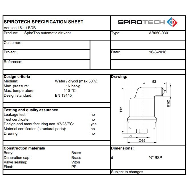 - Автоматический воздухоотводчик, подключение 1/2", 110°С, 16 бар, материал поплавка PP