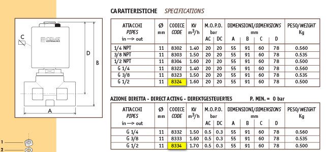 - Подключение 1/2", нормально закрытый, ПРЯМОГО ДЕЙСТВИЯ, 1, 7 м3/час, 230V, 50 Гц