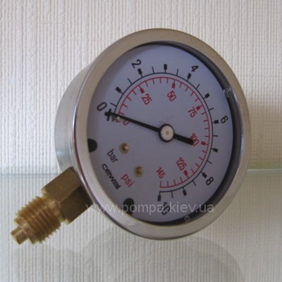 - Манометр с глицерином, шкала от 0 до 6 бар, диаметр 63 мм, подключение 1/4" сбоку