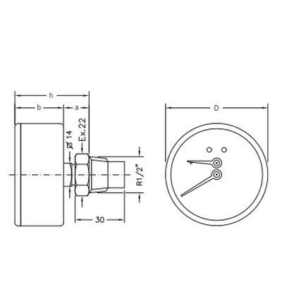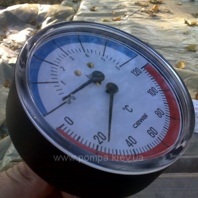- Пластиковый корпус, диам. 80 мм, подкл. 1/2" сзади, шкала 4 бар / 120 °С, в бойлерах, системах отопления