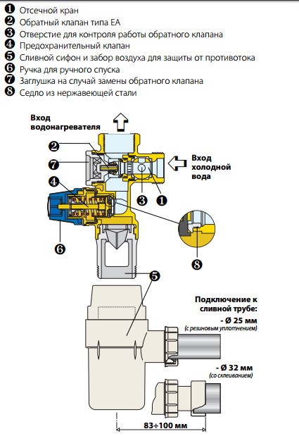 | Устройство, предназначено для защиты накопительных водонагревателей. Оно состоит из нескольких компонентов, которые выполняют следующие функции: защищают от превышения максимально допустимого давления в водонагревателе; не допускают возврата горячей воды в сеть подачи холодной воды; отсекают подачу холодной воды для проведения технического обслуживания водонагревателя. Технические характеристики: рабочая среда - вода, рабочее давление макс. 10 бар; рабочая температура макс. 120°С; установленное давление на предохранительном клапане 7 бар. мощность на выходе макс: прямой нагрев 4 кВт; косвенный нагрев 75 кВт; объём нагревателя макс. 200 л. Подключение 1/2". Конструкция. Схема подключения. Размеры. Комплект поставки: предохранительная группа, инструкция. |