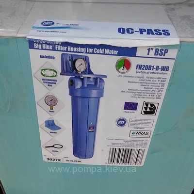Двухэлементный корпус повышенной производительности для холодной воды. Состоит из стакана и крышкой с латунной резьбой. Дополнительно оснащён воздушным клапаном, который позволяет выпустить, скопившийся воздух, после замены картриджа. В комплект входит и манометр, ключ и кронштейн. Корпус устанавливается перед устройством типа: умягчитель, обезжелезователь, бойлер. Для этих корпусов можно использовать большую гамму механических и угольных картриджей доступных на рынке. Корпус может быть смонтирован одинарно, либо в последовательном соединении из нескольких штук. Размеры (диаметр / высота) 180 х 605 мм. Диаметр резьбы 1". Рабочее давление макс. 6 бар. Рабочая температура макс. 45°С. Материалы: (корпус и крышка) - полипропилен, уплотнительное кольцо бутадиен-нитрильный каучук. Страна происхождения - Польша. Комплект поставки: корпус фильтра, кронштейн, ключ, манометр. | |